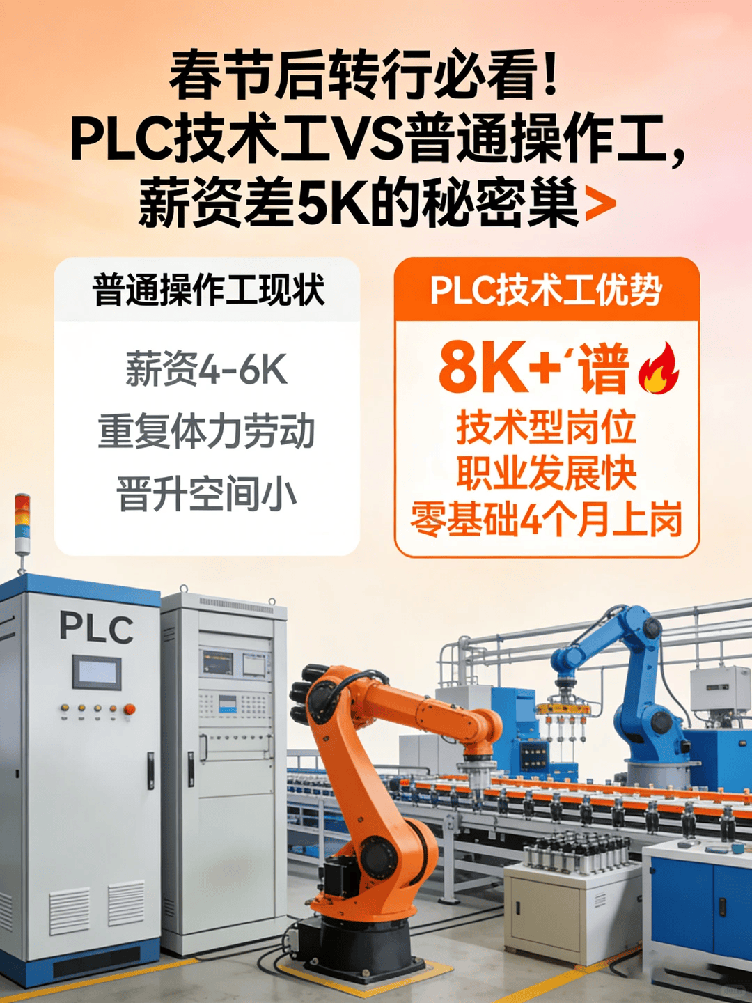 实和化课程系统!课程涵盖PLC根本编程、工业收集通信、工业机械人调试等模块,采用“理论+仿实+实操”三维讲授模式。配备2000平米实训,引入西门子S7-1200/1500、三菱FX/Q系列等工业级设备,支撑实正在产线项目实操。可参取春风汽车、新松机械人等企业的现实项目,堆集项目经验。