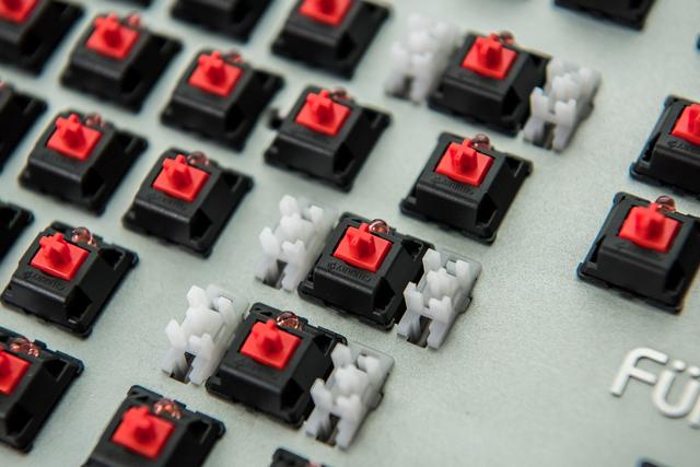 将87个键帽逐一拔掉,最初就成了这个样子,原厂Cherry轴可不是盖的呢,大要是年纪大了,对机械键盘起头逐步退烧,越来越喜好压力克数较低的红轴。
